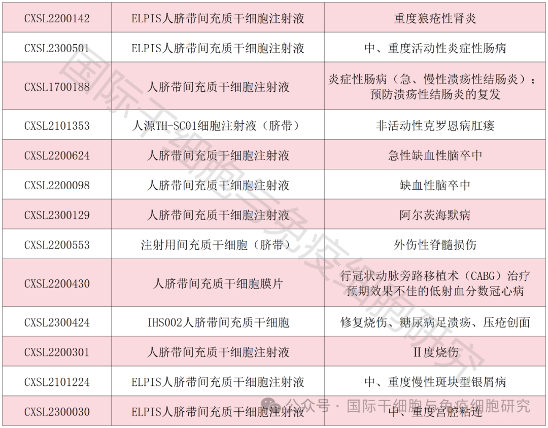 截至2023年,获国家药品监督管理局药品审评中心默许的间充质干细胞药物临床试验项目多达40余项,主要涵盖类风湿关节炎、膝关节炎、肺纤维化、肝硬化、脑卒中、心血管疾病等诸多领域(详见下表)。